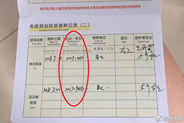 7月25日,大陆民众在微博上热传医生给小孩接种疫苗时,不再写疫苗的生产厂家,同时还上传了“免疫规划疫苗接种记录”卡的接种情况。