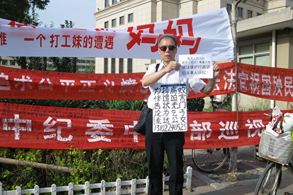 反腐维权人士张建中在天津最高法前打横幅表达诉求。(受访者提供)