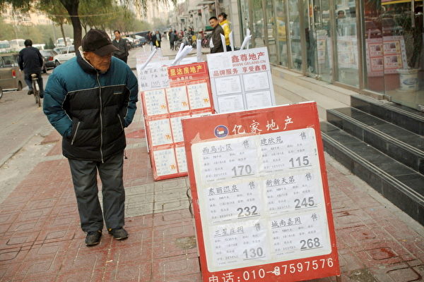 大陆去年12月份二手房价下降城市增加,有机构认为,大陆楼价拐点已经出现。图为北京一市民在房产中介门口看房屋价格牌。(GOU YIGE/AFP/Getty Images)