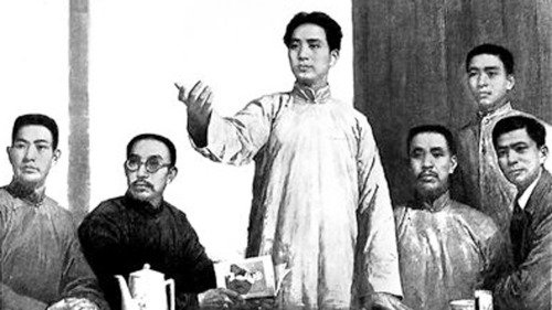 中共由苏俄共产国际策划建立,陈独秀被推选为总书记,毛泽东并未主持“一大”。图为中共关于毛主持“一大”的虚假宣传画,画中无当选总书记陈独秀。(网络图片)