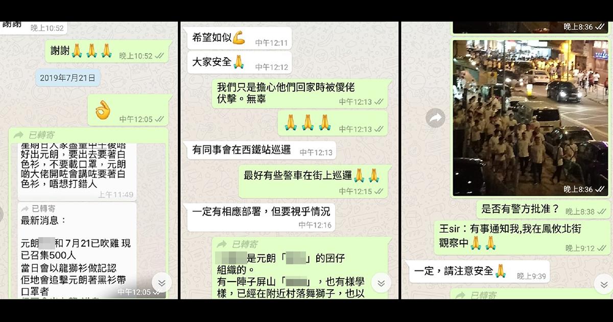 元朗区区议员麦业成向《立场新闻》记者出示其 WhatsApp对话记录。据截图显示,他周日中午十二时从朋友收到消息,指有人将会追击黑衣者。他于是将资料转发予元朗警区警民关系副主任。主任回覆「已安排人手应付,警方亦一直密切留意今日元朗同情况」,「有同事会在西铁站巡逻,亦有相应部署行动」。