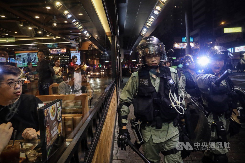 香港警方近日购入一万支伸缩警棍,10日起陆续派发给休班的警务人员随身携带,以便执法与防身。图为香港镇暴警察31日晚间整队强势驱离湾仔警署周围反送中示威者,与一旁商家内消费民众形成对比。