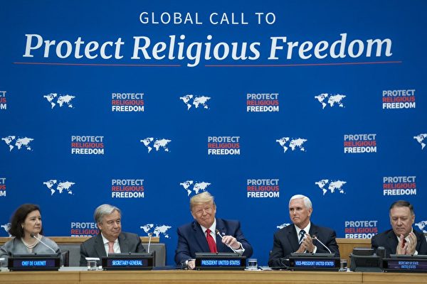 美国总统川普(中间者)与副总统彭斯(右二)和国务卿蓬佩奥(右一)出席23日在联合国总部举行的全球呼吁保护宗教自由会议。(彭斯推特)