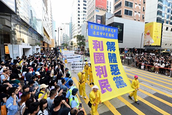 2018年10月1日,香港法轮功学员举行盛大的反迫害集会游行,要求停止中共持续19年的迫害,同时庆贺逾三亿中华儿女退出中共党团队组织。(宋碧龙/大纪元)