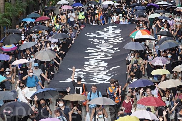 10月4日港府宣布订立《禁蒙面法》,引发许多香港民众的不满。图为10月5日,香港民众在港岛游行,从铜锣湾SOGO起步到中环遮打花园抗议《禁蒙面法》。(余钢/大纪元)