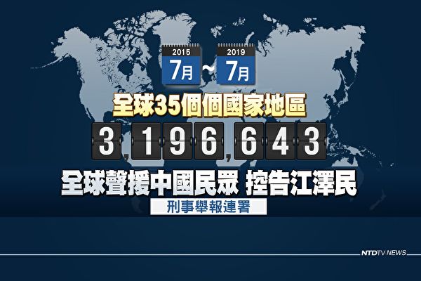 截至2019年7月19日为止,全球已有35个国家、近320万民众向中共最高检、最高法举报江泽民迫害法轮功的反人类罪行,要求法办元凶。(新唐人电视台)