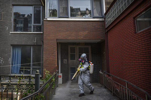 21日下午,北京调升中风险地区达37个,部分调升地未通报确诊病例,民众忧官方隐匿疫情。图为21日北京某单元楼进行消毒。