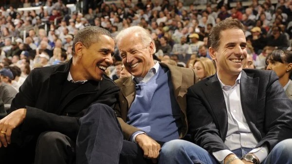 2010年1月30日,时任总统奥巴马和副总统乔.拜登和亨特.拜登一起观看篮球比赛。(图片来源:Mitchell Layton/Getty Images)