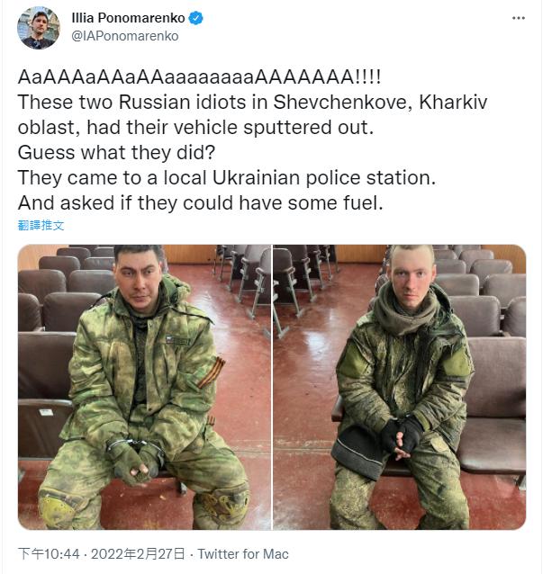 基辅独立报的记者伊利亚·波诺马连科(Illia Ponomarenko),在推特上发文表示,“这2个在哈尔科夫州舍甫琴科夫(Shevchenkove)的俄罗斯白痴,他们的车抛锚了。猜猜他们做了什么?他们来到了当地的乌克兰警察局,并问警员是否可以给一些燃料。”