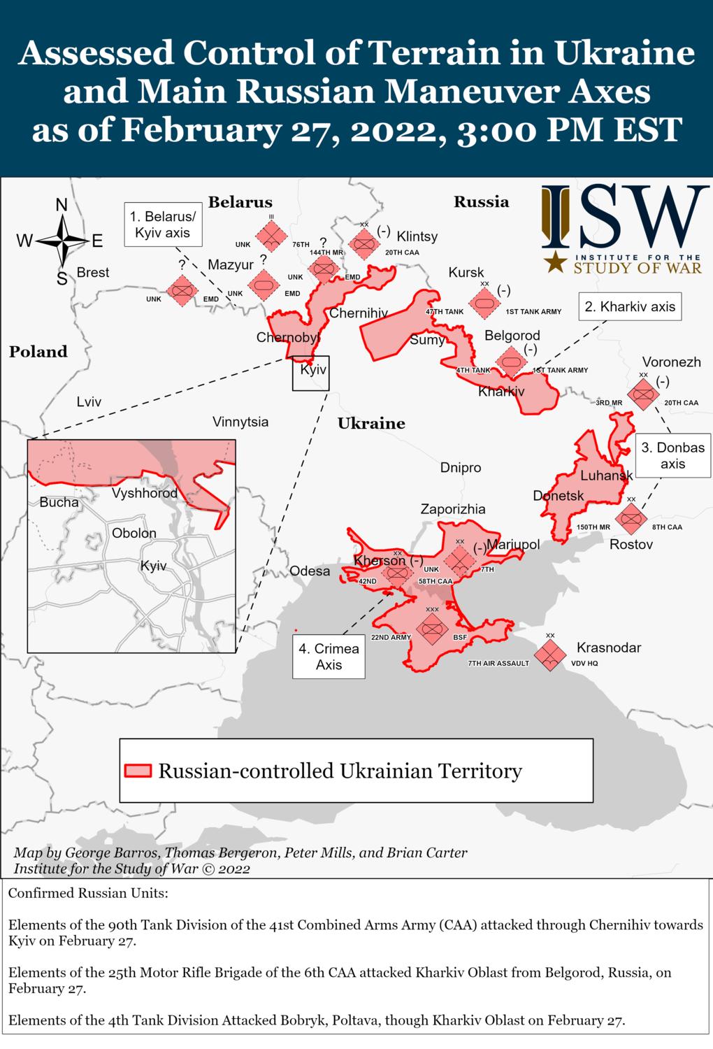 ISW指出,俄罗斯军队在2月26日至27日基本上暂停了行动,但可能会在未来几天恢复进攻行动并开始使用更多的空中和火炮支援。俄军空降兵和特种部队正在基辅西北部进行城市战,但尚未进驻首都。俄罗斯军队在第聂伯河两岸通往基辅的通道进行部分攻击,但却阻挡了能在乌克兰东北部的进攻行动。俄军应该会重新布局,并在前线部署额外的增援部队和空中补给。
