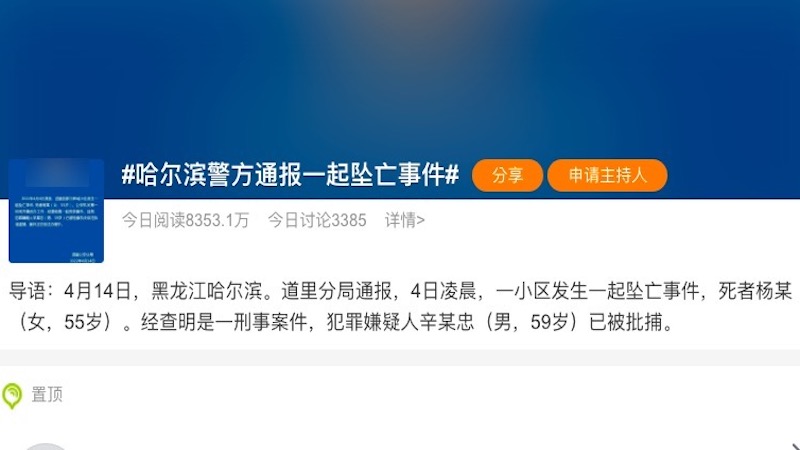 【新唐人北京时间2022年04月15日讯】本月初,黑龙江省哈尔滨市道里区一女子坠亡。最新通报称,嫌犯为死者丈夫、哈尔滨师范大学前党委书记辛某忠。辛某忠已被逮捕。