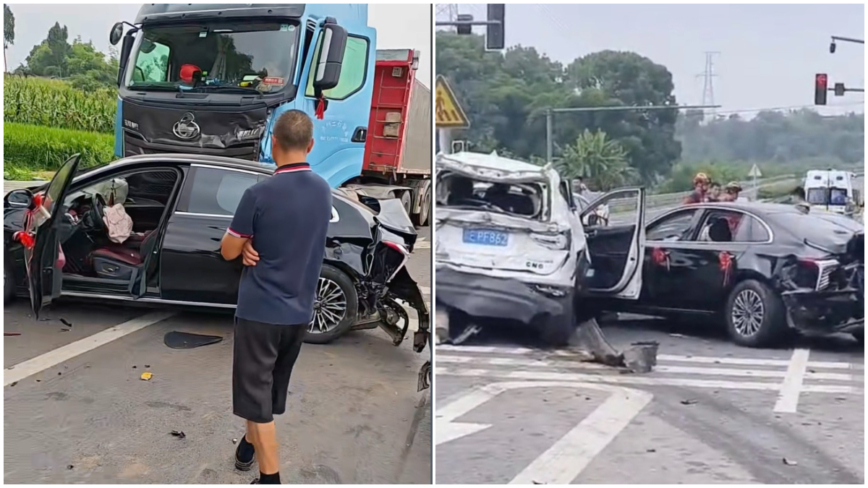 在抖音平台,知情网友发帖透露,婚车是租的车队,婚车在等红绿灯的时候被大货车撞了,事故大货车负全责。无人死亡,有人轻伤,损坏4辆车报废2辆车。事故导致婚礼延后到下午1点。