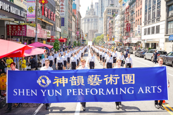 2025年7月20日,部分神韵艺术家和法轮功学员在曼哈顿华埠举行法轮功反迫害26周年大游行。(张静怡/大纪元)