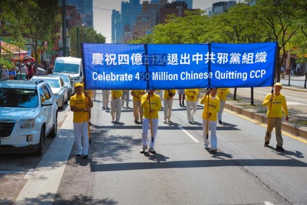 (大纪元记者伊铃多伦多报导)周六(8月16日),多伦多数百名法轮功学员在市中心举行集会和游行,声援4.5亿中国人退出中共党、团、队组织,呼吁民众觉醒,认识中共邪恶本质,解体中共,停止迫害。