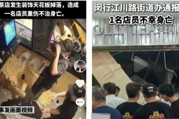(大纪元记者张钟元采访报导)8月15日晚,位于上海闵行金悦乐方店内,知名网红奶茶连锁品牌茉莉奶白门店发生装饰天花板掉落,致1名店员身亡。当时店里正在开展为期三天“买一送一”活动,没想到活动首日就以悲剧收场。