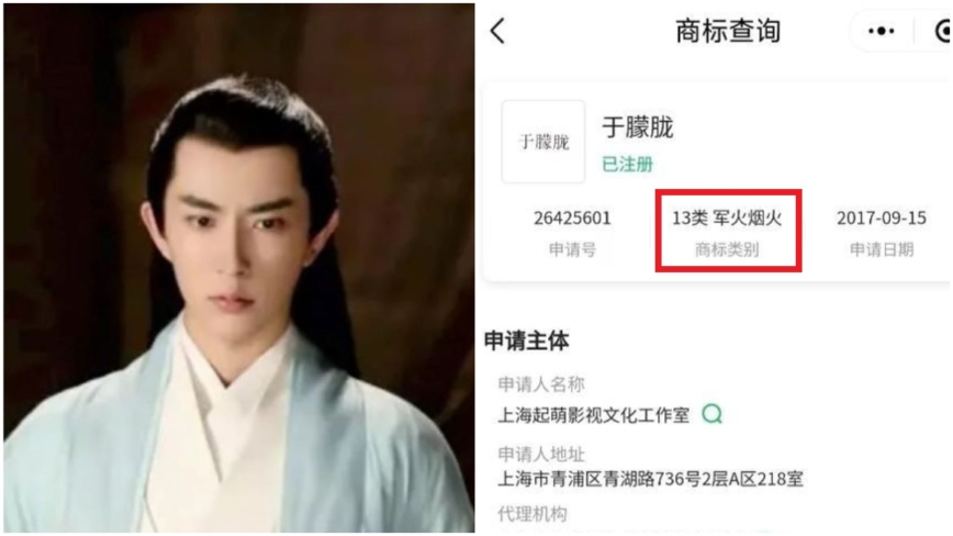 而网民在“企查查”查询发现,2017年9月15日,上海起萌影视文化工作室通过代理机构北京集佳知识产权代理有限公司,申请注册了一枚“于朦胧”商标,申请号是26425601,商标类别竟然是“第13类军火烟火”。