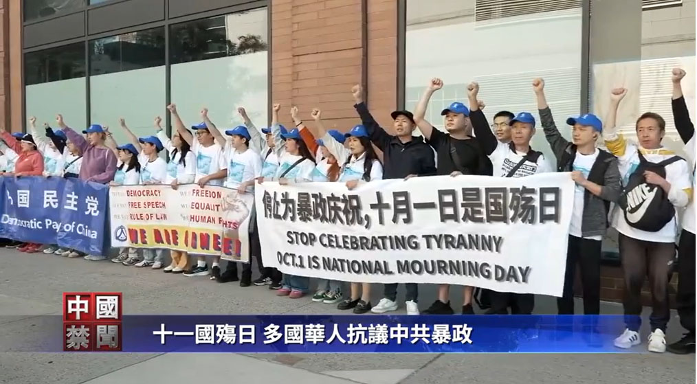 在美国纽约,中国民主党的近百名成员,10月1日在中共驻纽约的中领馆外举行抗议集会,揭露中共自1949年篡政以来对人民的迫害。