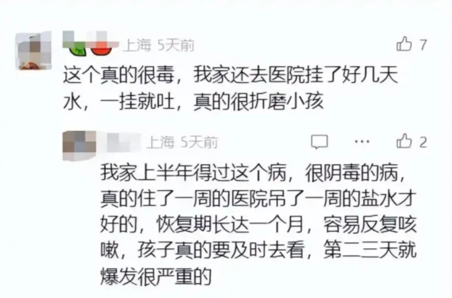 一位家长表示,她的孩子感染合胞病毒后,“咳嗽要咳一整夜”。另一位家长则担忧地表示,孩子感染合胞病毒后开始发热,最终发展成肺炎,正在接受挂水治疗。更令人忧心的是,合胞病毒具有家庭聚集性。