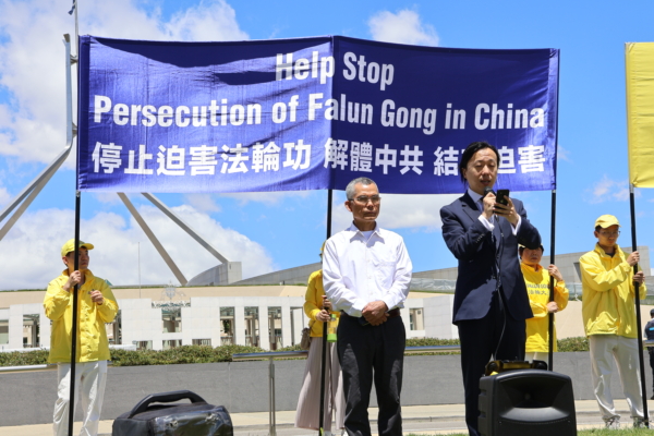 在中共第三号人物赵乐际访问堪培拉之际,2025年11月24日中午,部分澳洲法轮功学员在国会大厦前集会。图为法轮功学员李坤(左)在集会上发言。(文清扬/大纪元)