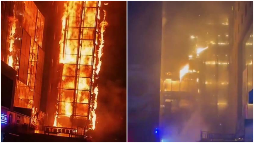 其中一段视频中,有一男一女在对话。根据对话,视频拍摄时间是凌晨3时左右,起火的疑似是一家高层商场,楼上还有住户,旁边则是居民楼。两人说,起火的大楼里“还有人啊”,“里面住的就是人,不可能没人”。