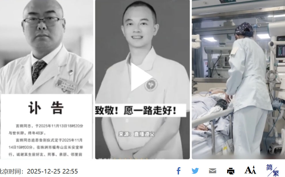 【新唐人北京时间2025年12月25日讯】中国疫情肆虐,各种并发症增加,医院各科室人满为患,猝死的老年人和年轻人激增。而医护人员被大幅降薪,压力大又经常超时工作,加上熬夜值班,猝死率更高。
