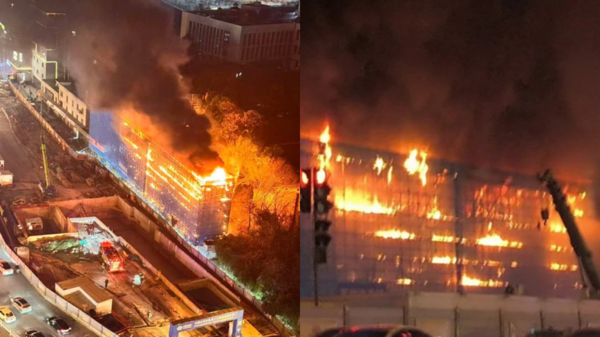 根据网传画面可见,起火的建筑大约有十层左右,火灾发生后,火势迅速烧至楼层顶部,现场浓烟冲天,火光将附近的建筑工地照得通亮。