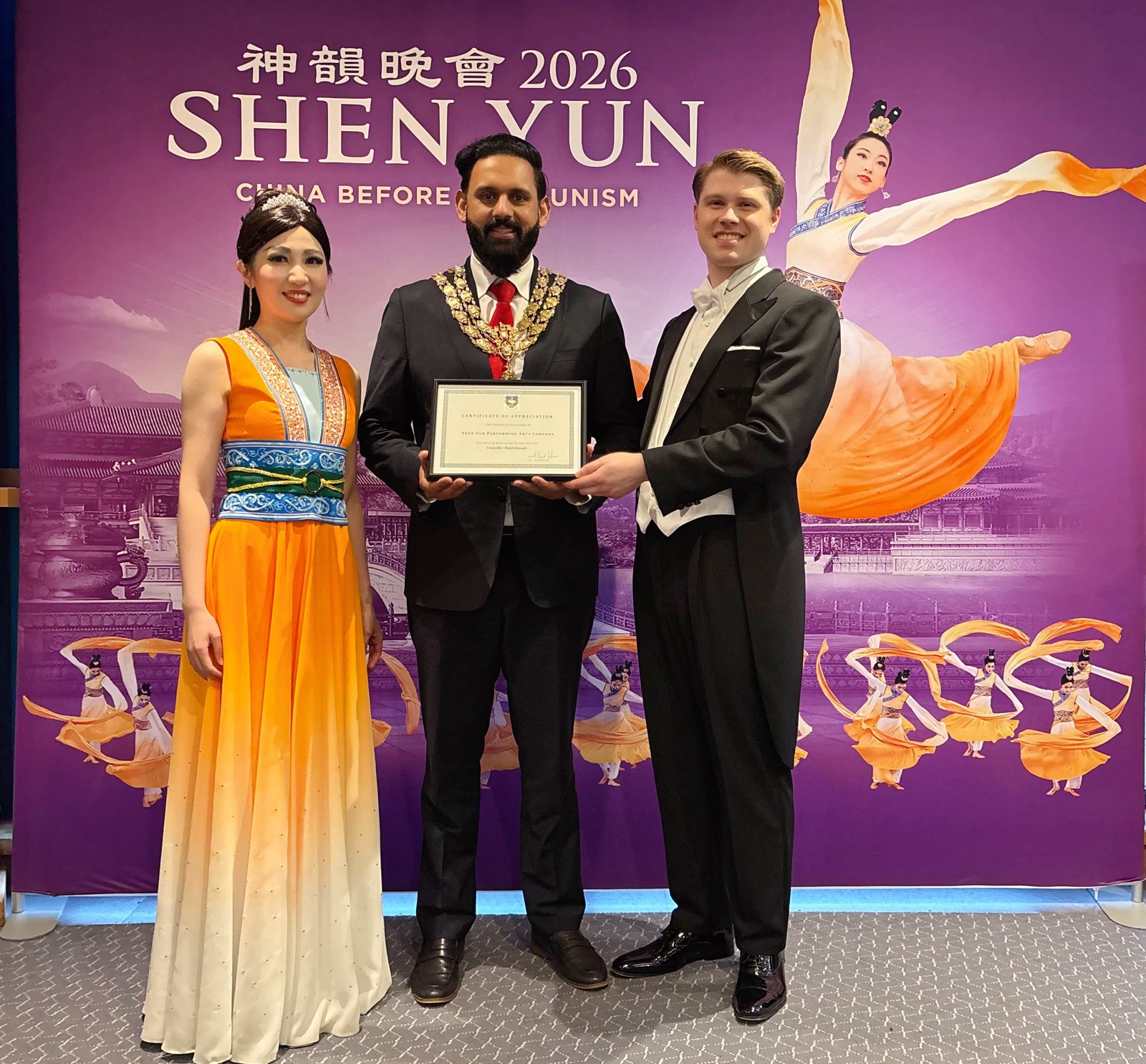 图1:二零二六年二月二十六日,神韵环球艺术团在英国海威科姆市的威科姆天鹅剧院演出观众爆满,当地市长马吉德·侯赛因(中)亲自到场向神韵环球艺术团代表颁发感谢狀。(明慧网)