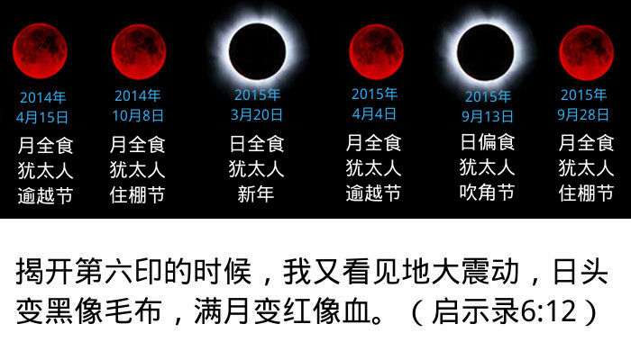 2014和2015的连续出现四次“血月”(每年两个,连续两年)。〝血月〞出现预示着天下将发生不同寻常之事〝血月〞属于罕见的天文奇景,在过去的500年中只出现过3次,纵观中国历史,凡是改朝换代的关键时刻,都会出现很多常理无法解释的异象,或许是上天对世人的警示。多种异常天象寓意中共气数已尽。