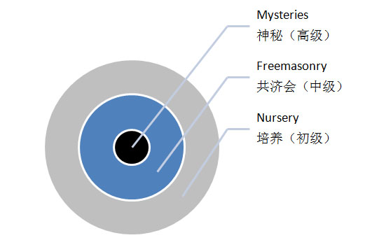 从抄到的光照帮的原始文件中人们发现,光照帮会员分为严格的等级(见下面的示意图),大致可分为三大类:初级,中级,神秘(高级)。每一类下面又分若干等级。外面的两大类(初级和中级),类似那个“羊皮”,其中的会员仍然被告知是为了“人类的幸福大家庭”。只有进入神秘类的级别(高级)会员才逐渐被告知其真正的目的[19]。这反映出,光照帮非常谨慎小心,因为其知道自身的邪恶。真正进入高级类的会员只是少数,对那些不清楚其真正目的的大多数外围人员,魏萨普说,一方面他们可以壮大声势,另一方面可以填满钱盒子。共产党统战的精神也是如此。