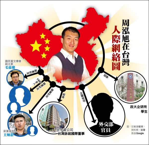 台北检方指控周泓旭在2015年11月至2016年1月期间在大陆接受一名担任”党务或其他公务机构”之李姓秘书的餐叙招待,后者多次表示可提供金钱,由周泓旭利用在台在学及经商期间,物色、引介政党人士、军、警、情治、外交等现职公务员及有影响力人士赴境外第三地,与大陆官员认识。李姓秘书还表示,可依照所吸收对象的重要性,为周泓旭提供一定的报酬。