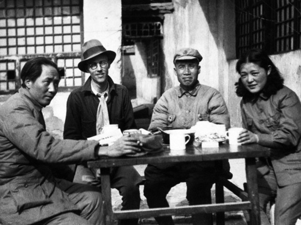 1937年3月底,吴莉莉(右一)给采访毛泽东、朱德的美国合众社驻天津记者厄尔·利夫担任翻译