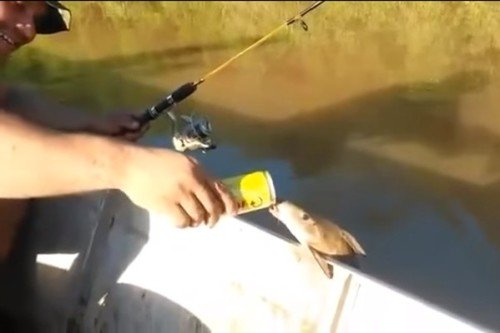 从网络上流传的一段影片中可见,一条鱼靠在船边张着嘴,似乎在讨酒喝。一名钓客则左手拿着鱼竿,右手拿着啤酒把酒直接倒进鱼的嘴里。